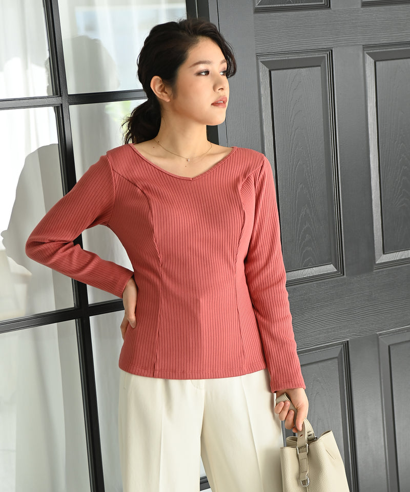 人気のワイドテレコカットソーから、春らしいカラーが新登場。これまでのシリーズよりも下着のストラップがみえづらく、胸元がのぞきづらいVネックラインにアップデート。ベーシックアイテムなので、1枚あればぐっとコーディネートの幅が広がります。表面にはブライト糸が使われている、エレガント見えするシャイニーリブ生地を使用。着心地もよい長袖カットソーは着回しの効く必須のアイテムです。※こちらのカットソーはワイドテレコカットソーと同アイテムです。 ■機能1HEART CLOSETの立体的な裁断でバストを丸く包み込みながらもアンダーバストからウエストはスッキリしたシルエットに。 ■機能2スッキリとしたVネックはデコルテを綺麗に見せ、胸元も覗きづらいカッティングに設計。■機能3縦リブのデザインでスタイルアップ。