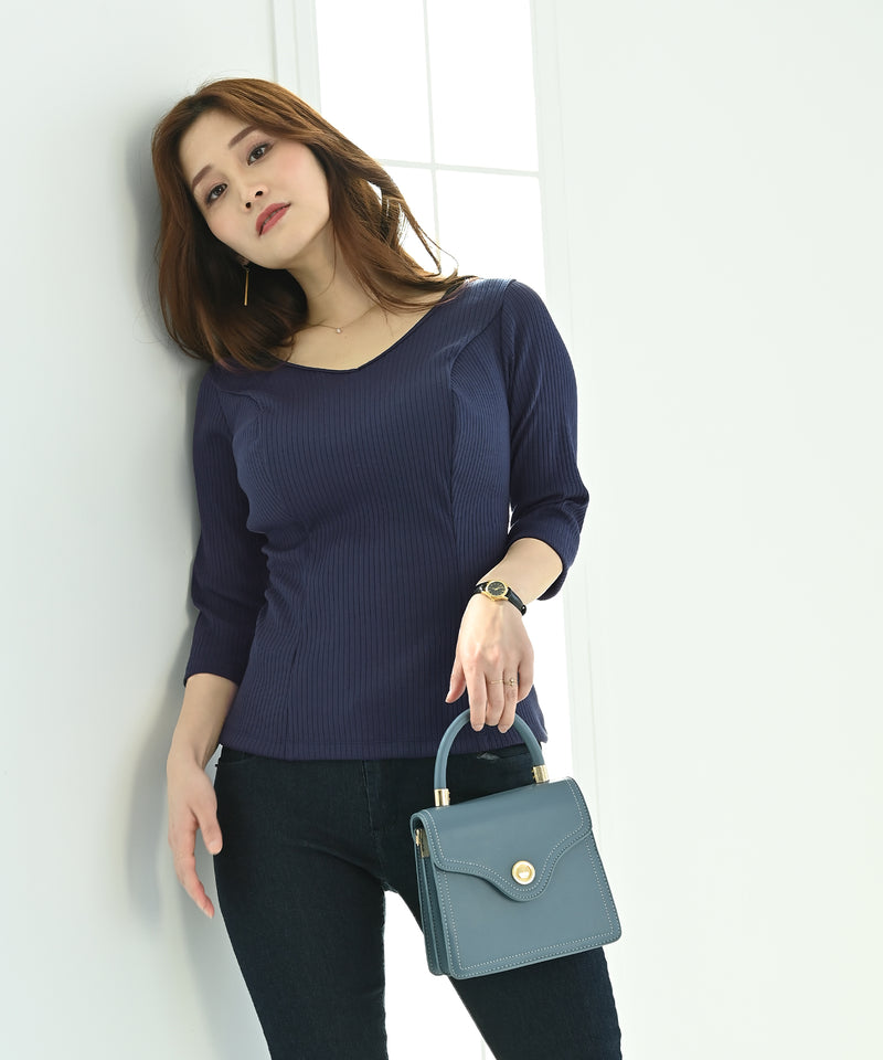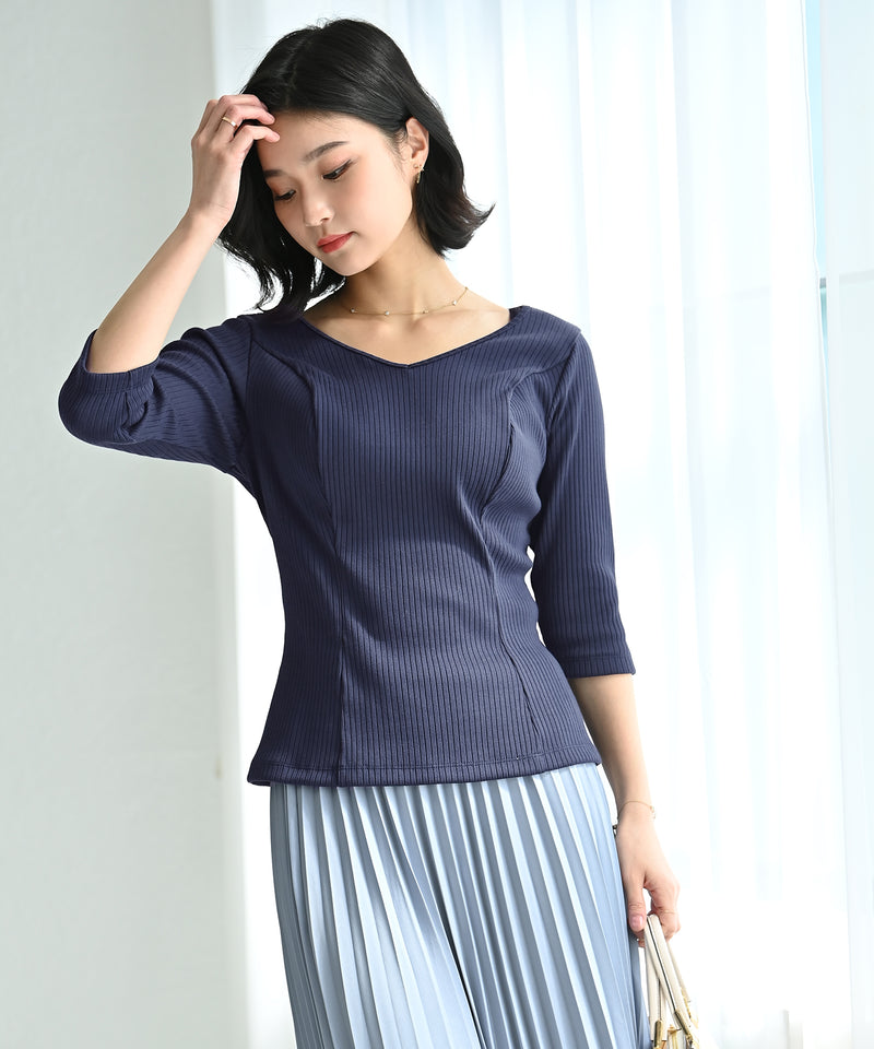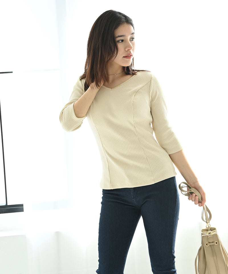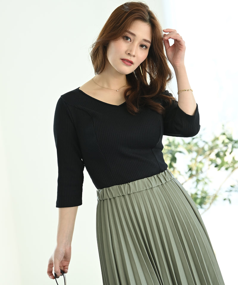 人気のワイドテレコカットソーから、7分袖丈が登場。 ベーシックアイテムのリブカットソーは、1枚あればぐっとコーディネートの幅も広がります。表面にはブライト糸が使われている、エレガント見えするシャイニーリブ生地を使用。着心地もよい長袖カットソーは着回しの効く必須のアイテムです。※こちらのカットソーはワイドテレコカットソーと同素材です。 ■機能1HEART CLOSETの立体的な裁断でバストを丸く包み込みながらもアンダーバストからウエストはスッキリしたシルエットに。 ■機能2スッキリとしたVネックはデコルテを綺麗に見せ、胸元も覗きづらいカッティングに設計。■機能3縦リブのデザインでスタイルアップ。