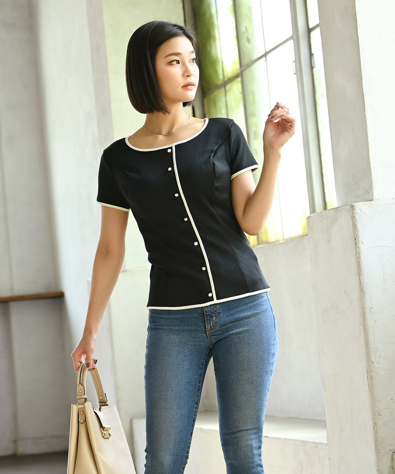配色パイピングが目を引く、パールボタンカットソー。 華美すぎない洗練されたデザインが、コーディネートの幅をぐっと広げます。ほどよい光沢のフロントのフェイクボタンで、エレガントな印象に。肌当たりの良い上質なコットンリブ素材を使用しています。パイピング部分も同素材を使用している為、ストレスフリーな着心地となっています。毎日でも着たくなる一枚です。 ■機能1HEART CLOSETの立体的な裁断でバストを丸く包み込みながらもアンダーバストからウエストはスッキリしたシルエットに。 ■機能2広めに開けたラウンドネックは首元をスッキリ見せつつも、下着のストラップや胸元が覗きづらいカッティングにデザイン。 ■機能3フロントをフェイクボタンにすることで、どんな動作でもバストやインナーが除かない設計に。