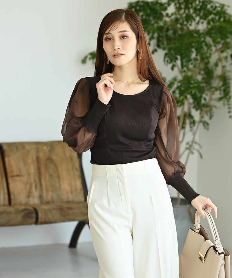 人気のシフォンパフスリーブカットソーが、長袖になって再登場。1枚着るだけで、大人っぽく女性らしいスタイルに格上げ。少し光沢のあるコットンリブ生地で、上品見えしながらも快適な着心地に。トレンド感のあるシアー素材に、普段使いしやすい3色を揃えました。 ■機能1HEART CLOSETの立体的な裁断でバストを丸く包み込みながらもアンダーバストからウエストはスッキリしたシルエットに。 ■機能2広めに開けたラウンドネックは首元をスッキリ見せながらも、下着のストラップや胸元が覗きづらいカッティングしに設計。 ■機能3バストで持ち上がり短くなりがちな前見頃の裾丈も、バストで持ち上がった時にちょうど良い、少し長めの丈感に。