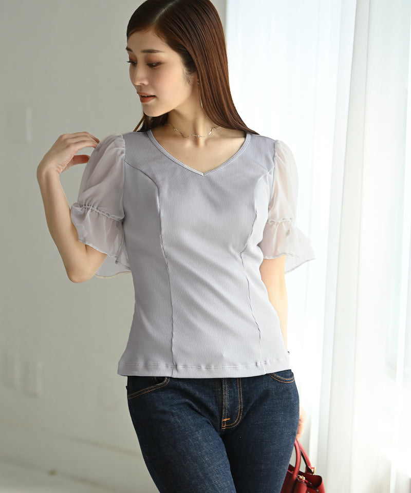 春らしい印象のシフォンパフスリーブカットソー。1枚着るだけで、大人っぽく女性らしいスタイルに格上げ。少し光沢のあるコットンリブ生地で、上品見えしながらも快適な着心地に。トレンドのあるシアー素材に、普段使いしやすい3色を揃えました。 ■機能1HEART CLOSETの立体的な裁断でバストを丸く包み込みながらもアンダーバストからウエストはスッキリしたシルエットに。 ■機能2広めに開けたラウンドネックは首元をスッキリ見せながらも、下着のストラップや胸元が覗きづらいカッティングしに設計。 ■機能3バストで持ち上がり短くなりがちな前見頃の裾丈も、バストで持ち上がった時にちょうど良い、少し長めの丈感に。