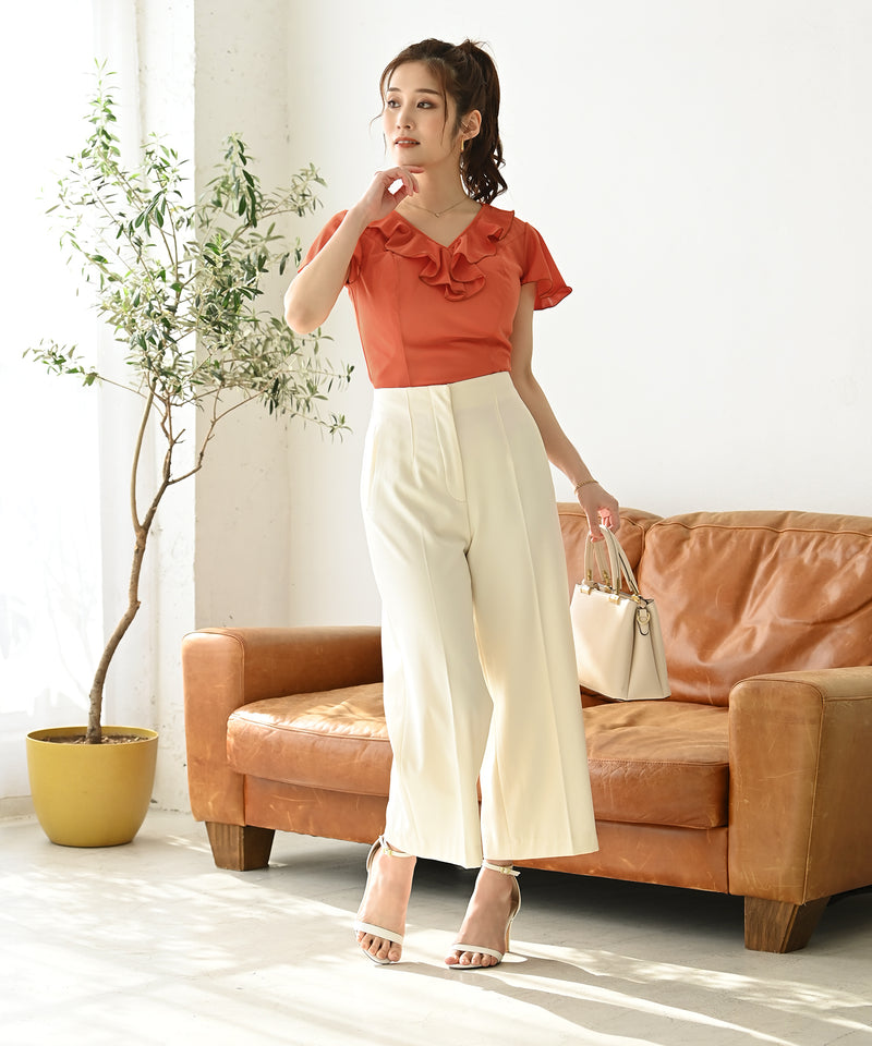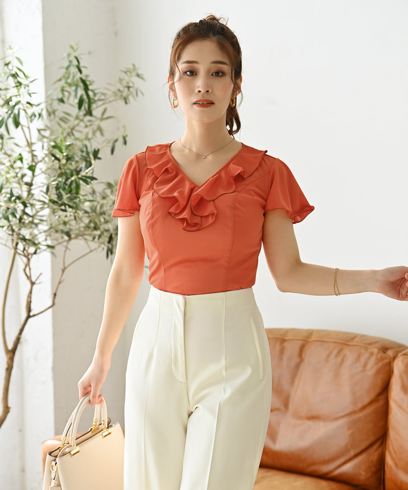 ネックラインにフリルのあしらわれた、上品トップス。ストレッチの効いたポリエステル生地はシワになりづらく、オフィスでも普段使いのアイテムとしても大活躍。カジュアルな素材なのでフェミニンになりすぎず、リッチな見映えに。ウエストまわりもスッキリしているので、ボトムを選ばず合わせやすいアイテムです。