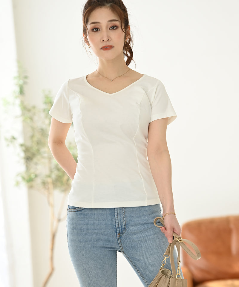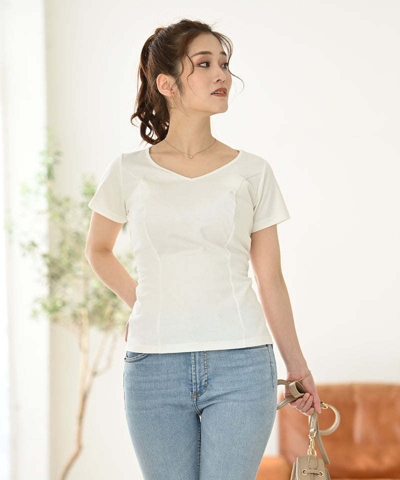 清涼感のあるポンチ素材の半袖カットソー。ウォッシャブルな国産素材で、ご家庭でお洗濯が可能です。程よく身体にフィットし、デザイン性と通気性を兼ね備えた万能な一枚。しっかりとしたコットン100%の生地は淡色でも下着が透けにくく、快適にお過ごしいただけます。程良く光沢のある素材で、カジュアルにもエレガントにも着こなせます。 ■機能1HEART CLOSETの立体的な裁断でバストを丸く包み込みながらもアンダーバストからウエストはスッキリしたシルエットに。 ■機能2接触冷感の機能加工を施し、暑い夏でも快適に。■機能3スッキリとしたVネックはデコルテを綺麗に見せ、胸元も覗きづらいカッティングに設計。