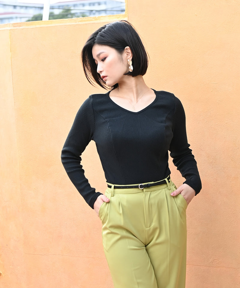 袖口の金ボタンがアクセントのトップス。ふくらみのあるヴァージンウールとコットンを貼りあわせた特殊素材を使用したカットソー。表地はウール素材で寒い季節に暖かさ保ち、肌にあたる内側はコットン生地でお肌への刺激が少なく着用できるアイテム。ベーシックカラーを揃え、ハートクローゼットオリジナルのカッティングパターンですっきり仕立てたシルエットはどんなコーディネートでも合わせやすい1枚。 ■機能1HEART CLOSETの立体的な裁断でバストを丸く包み込みながらもアンダーバストからウエストはすっきりとSTYLE UPする形状に仕上げました。 ■機能2かがんでもバストが覗き辛い、絶妙なVネック。