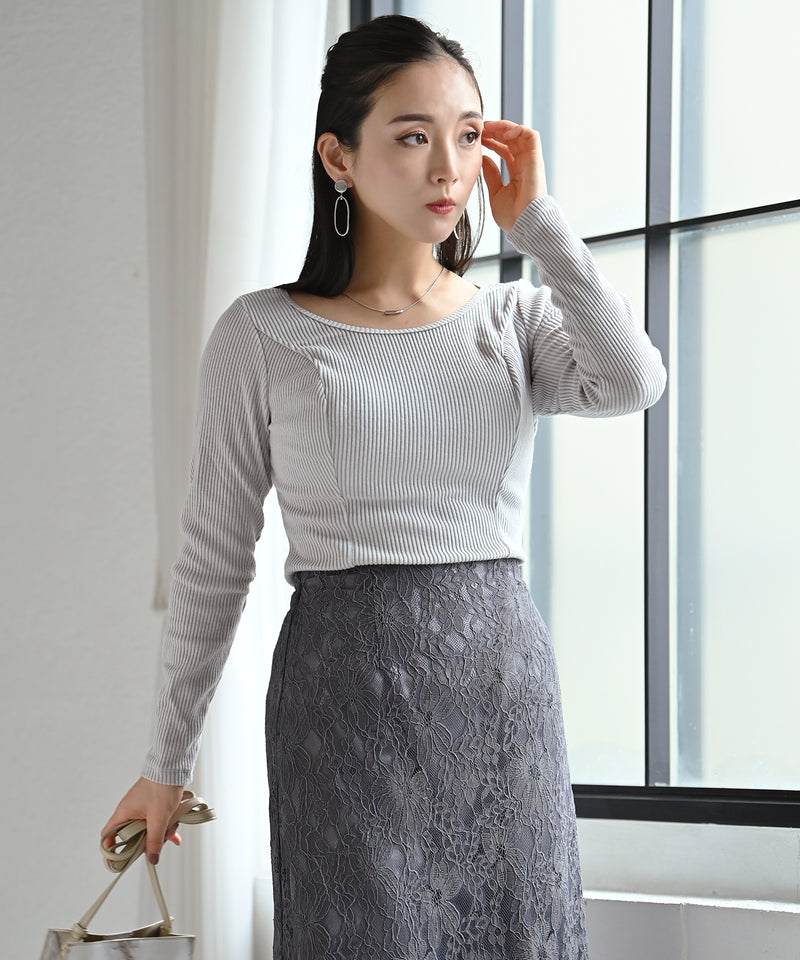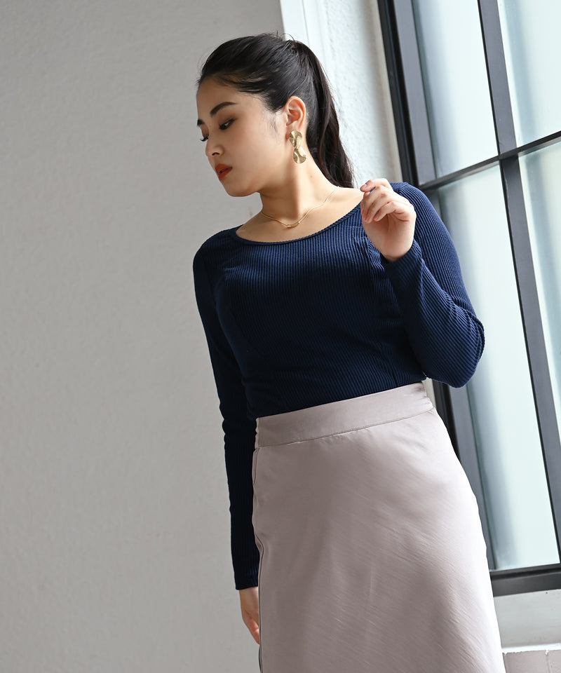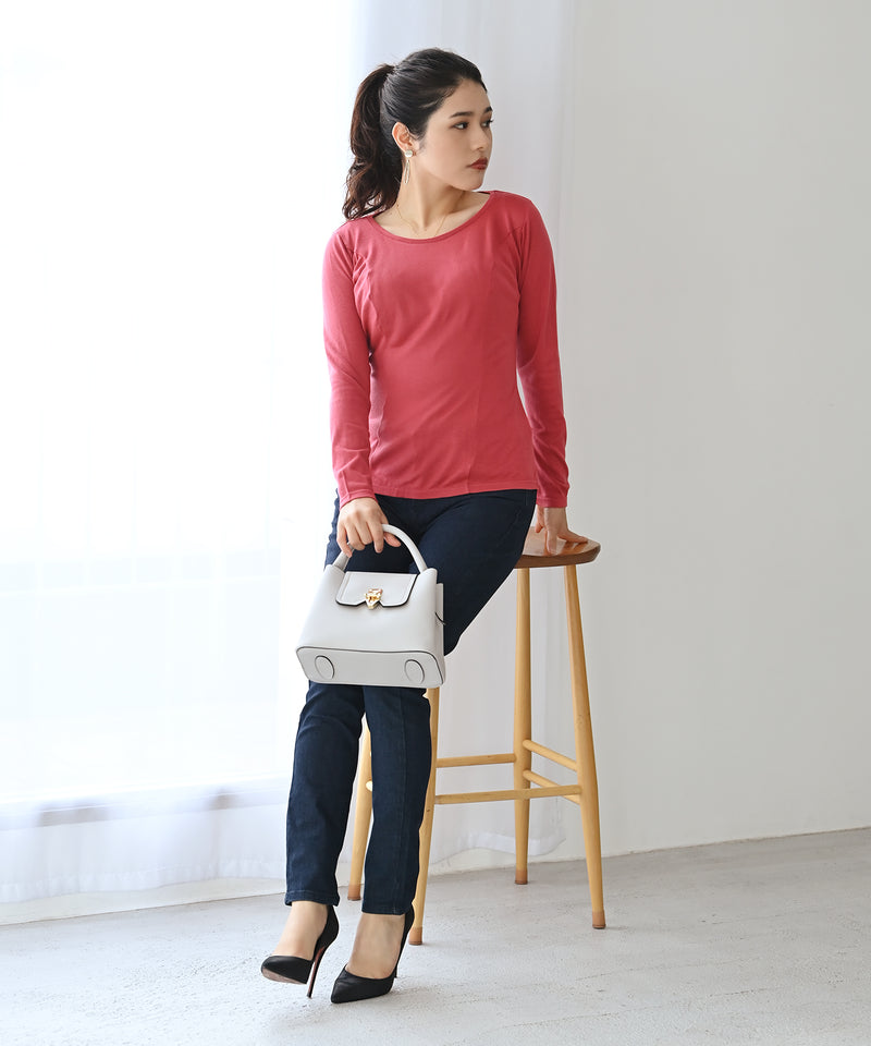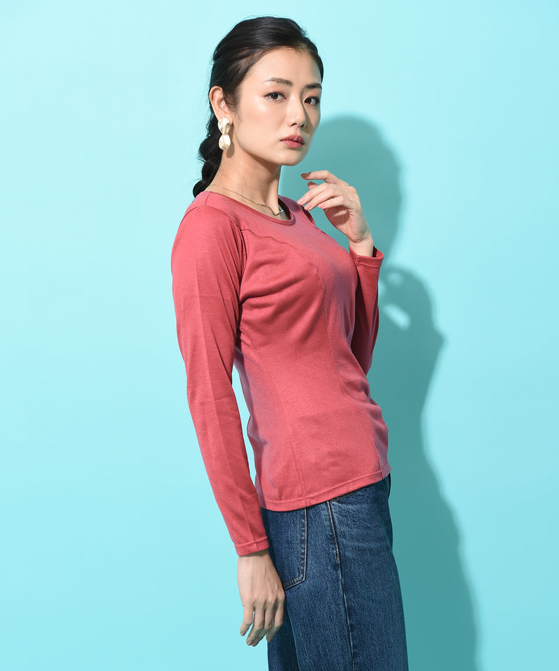 スカラップカッティングの長袖リブカットソー。湿気や汗を熱に変えて保温する特殊加工生地で、寒い季節でも暖かく過ごしていただけます。レーヨン混でソフトでなめらかな風合いと、ストレッチ性で動きやすさも重視。ピリング加工を施し毛玉にもなりづらく、やわらかな生地感で肌あたりも抜群です。デコルテをすっきり美しく見せ、かがんでも谷間がのぞかない設計に。 ■機能1HEART CLOSETの立体的なシルエットでバストを丸く包み込みながらもアンダーバストからウエストはスッキリしたシルエットに。■機能2ピリング加工を施した国産生地で毛玉にもなりづらく、やわらかな生地感で肌あたりも抜群。■機能3襟ぐりはほどよいスカラップカッティングで、デコルテを美しく。