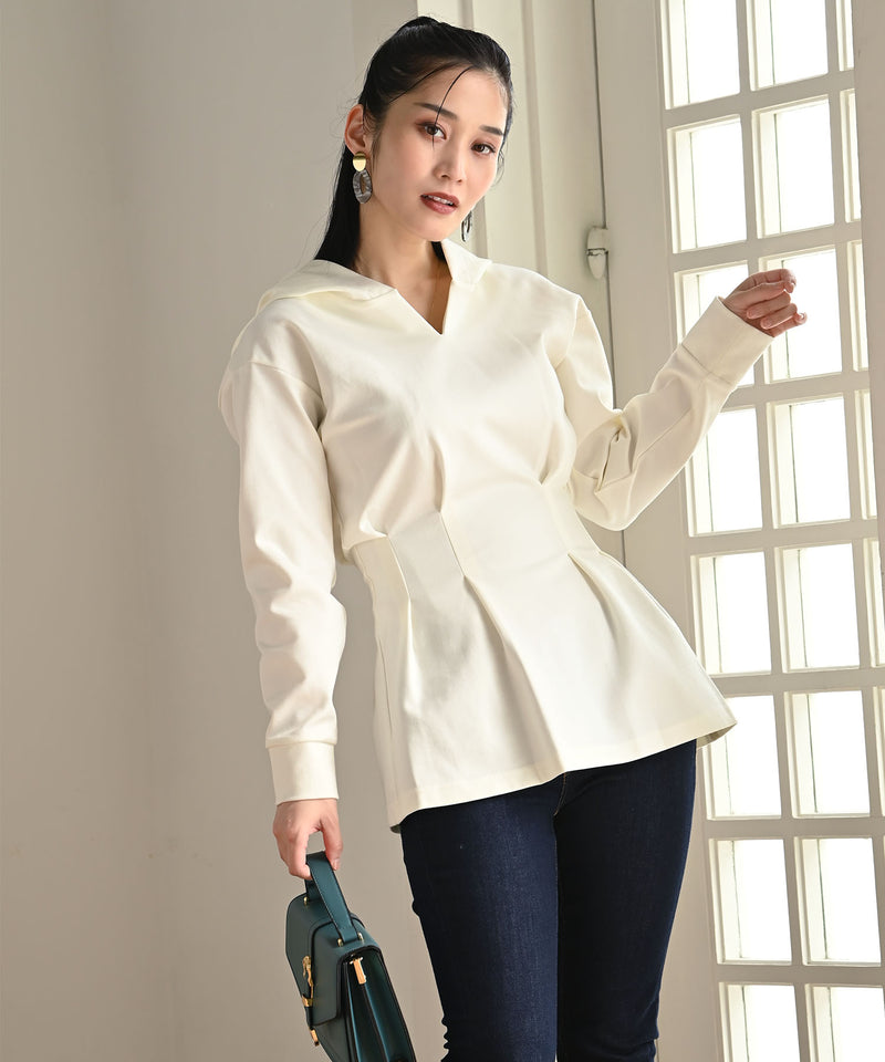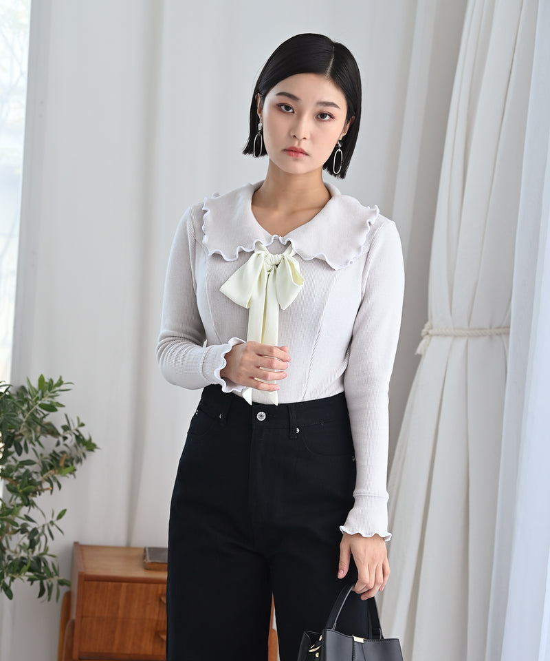 【DESIGN】トレンドのビックカラーを採用したプルオーバー。胸の大きな女性が着こなしやすい大きめのカラー、リボン幅に設計し胸元のバランスを整え美しく見せる効果を。襟やフレア袖にはバイカラーのメロウを施し、密やかなワンテク感のあるデザインに。首元のリボンは取り外し可能でコーディネートやシーンあわせ変化を楽しめるアイテムです。【FABRIC】ソフトな風合いが特徴の、弾性回復力に富んだリブ素材。軽やかな膨らみ感と保温性があり、肌触りもよく、そっとボディラインにフィットしてくれます。【STYLING】スカートと合わせた甘めから、パンツと合わせたマニッシュな着こなし。ジャンパースカートとのレイヤードなどコーディネートのバリエーションが豊富なのもポイント。 【Attention】本商品は予約商品です。通常商品と予約商品を同時にご購入いただいた場合は、商品はすべてそろい次第の発送となりますので、ご注意ください。1月下旬発送予定