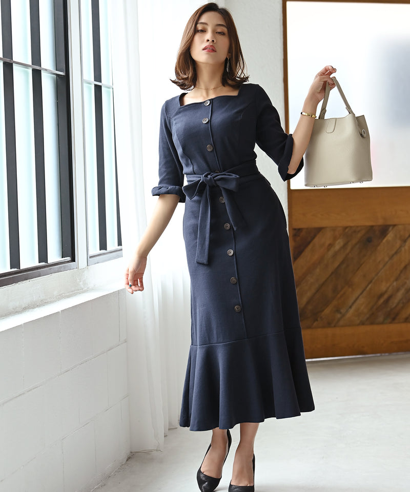 袖口のさりげないフリルがポイントのフロントボタンワンピース。トレンド感のあるマーメイドデザインで女性らしい印象に。裾に広がるフレアなシルエットが足元をすっきり見せてくれます。ベルトなしでも着れる2way仕様。ベルトをつけて着ると、よりスタイルアップ見えが可能に。1枚着るだけでコーディネートが完成し、主役になれるワンピースです。 ■機能1HEART CLOSETの立体的な裁断でバストを丸く包み込みながらもアンダーバストからウエストはすっきりとSTYLE UPする形状に仕上げました。 ■機能2フロントのボタンはフェイク仕様にし、ボタンの隙間が開かない設計に。■機能3かがんでもバストが覗きにくく、デコルテをスッキリみせるスクエアネック。■機能4両脇にはポケットをつけ、ユーティリティもプラス。