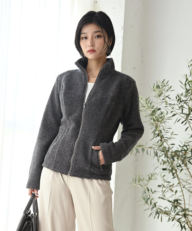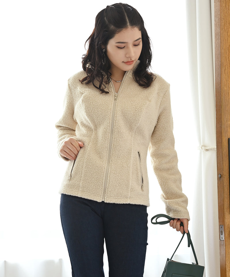 軽さと暖かさを兼ね備えたボアフリースジャケットが登場。着膨れしがちなボアフリースを、HEART CLOSETならではの立体裁断で、身体に沿ったシルエットにデザインしました。スタンドカラーで首元まで暖かい上品なデザインに。カジュアルスタイルはもちろんのこと、エレガントなスタイルにも合わせていただけます。真冬にはコートやジャケットのインナーとしてもご利用できます。 ■機能1HEART CLOSETの立体的な裁断でバストを丸く包み込みながらもアンダーバストからウエストはすっきりとSTYLE UPする形状に仕上げました。 ■機能2両サイドにはポケットをつけ、ユーティリティもプラス。 ■機能3伸縮性のある裏地を使用することにより、快適な着心地を追求。 ■機能4環境を配慮した国産リサイクルウール配合の特別なボアを使用。