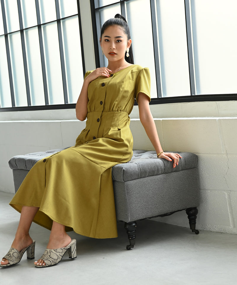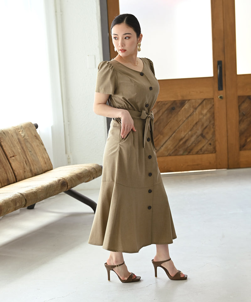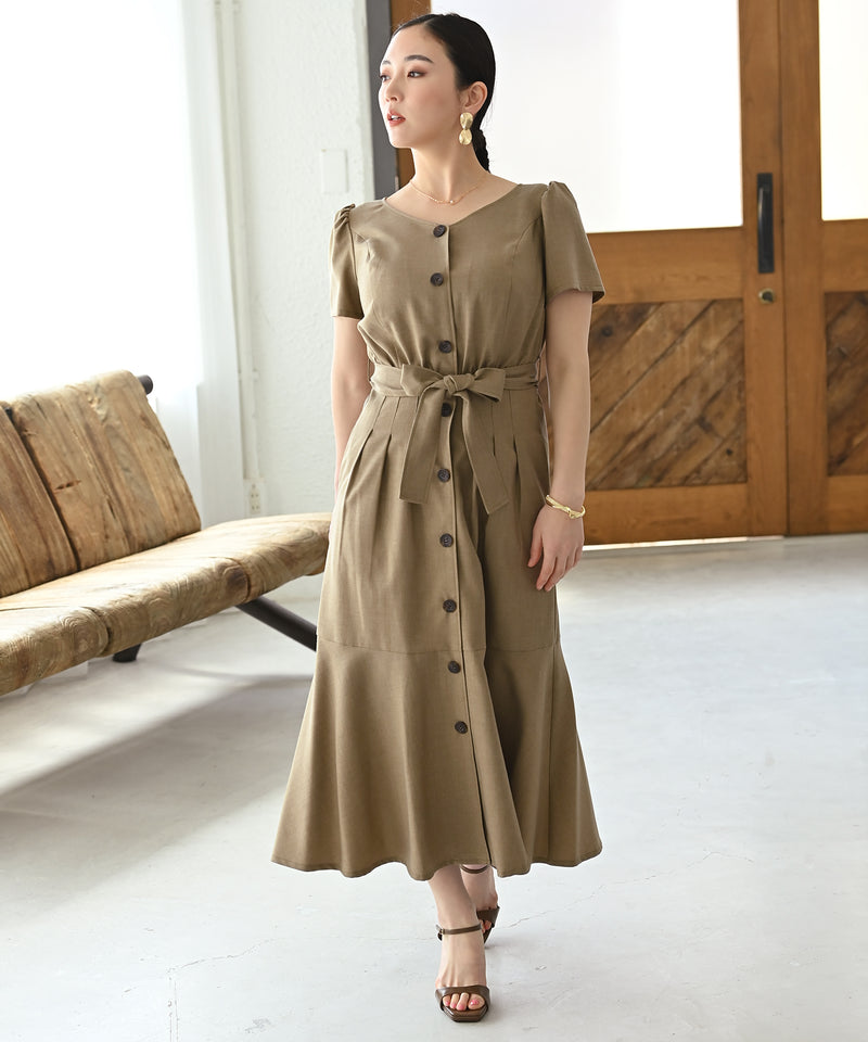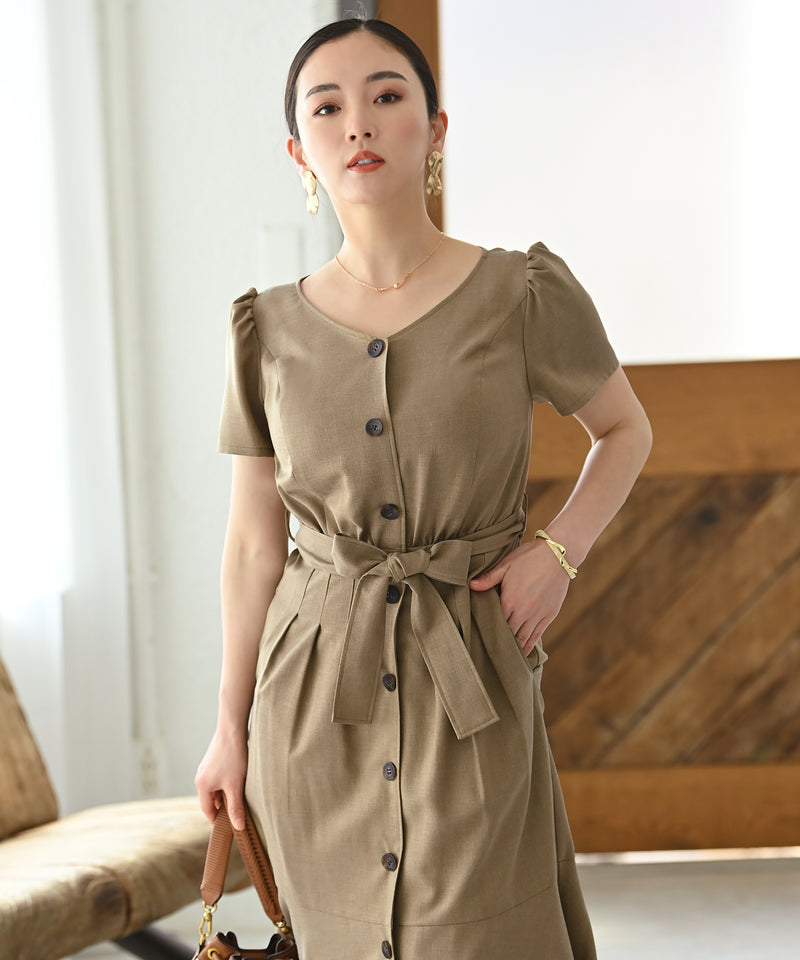 夏らしく、着心地の良いリネンライクなフロントボタンワンピース。毎日でも着たいワンピースは、麻混のドライポリエステル素材でシワになりづらく、お手入れも簡単に。1枚着るだけでコーディネートが完成し、主役になります。■機能1フロントのボタンはフェイク仕様にし、ボタンの隙間が開かない設計に。■機能2HEART CLOSETの立体的な裁断でバストを丸く包み込みながらもアンダーバストからウエストはスッキリしたシルエットに。 ■機能3かがんでもバストが覗きにくく、デコルテをスッキリみせるVネック。 ■機能4両脇にはポケットをつけ、ユーティリティもプラス。