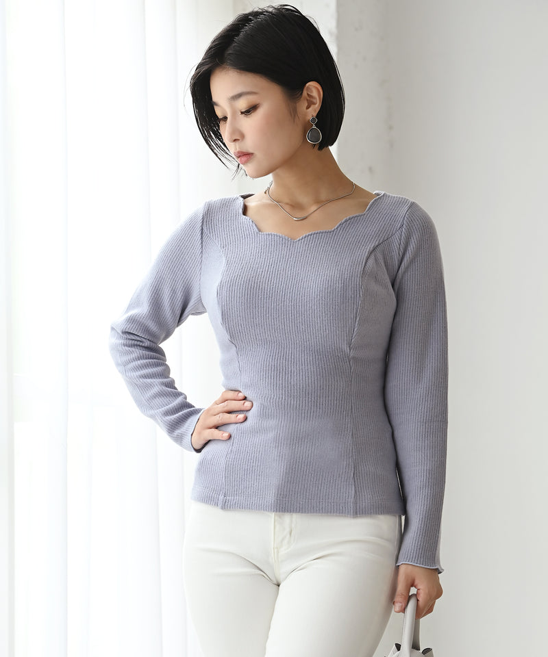 スカラップカッティングの長袖ニットソー。人気のスカラップカットソーを長袖にチェンジし、あたたかいニット素材で仕立てました。デコルテをすっきり美しく見せ、かがんでも谷間がのぞかない設計に。ボリューム感と軽量感を併せ持ったウール混素材で、冬でも暖かく快適にお過ごしいただけます。 ■機能1HEART CLOSETの立体的なシルエットでバストを丸く包み込みながらもアンダーバストからウエストはスッキリしたシルエットに。■機能2ふんわりとしたふくらみのある編立のリブウール素材で、寒い冬でも暖かく。■機能3襟ぐりはほどよいスカラップカッティングで、デコルテを美しく。