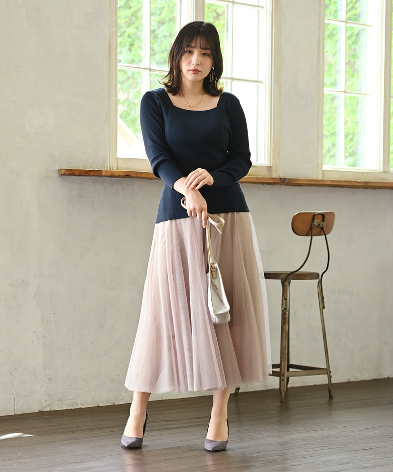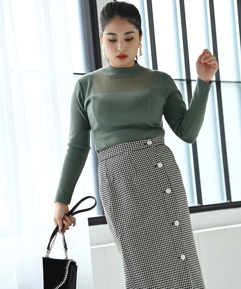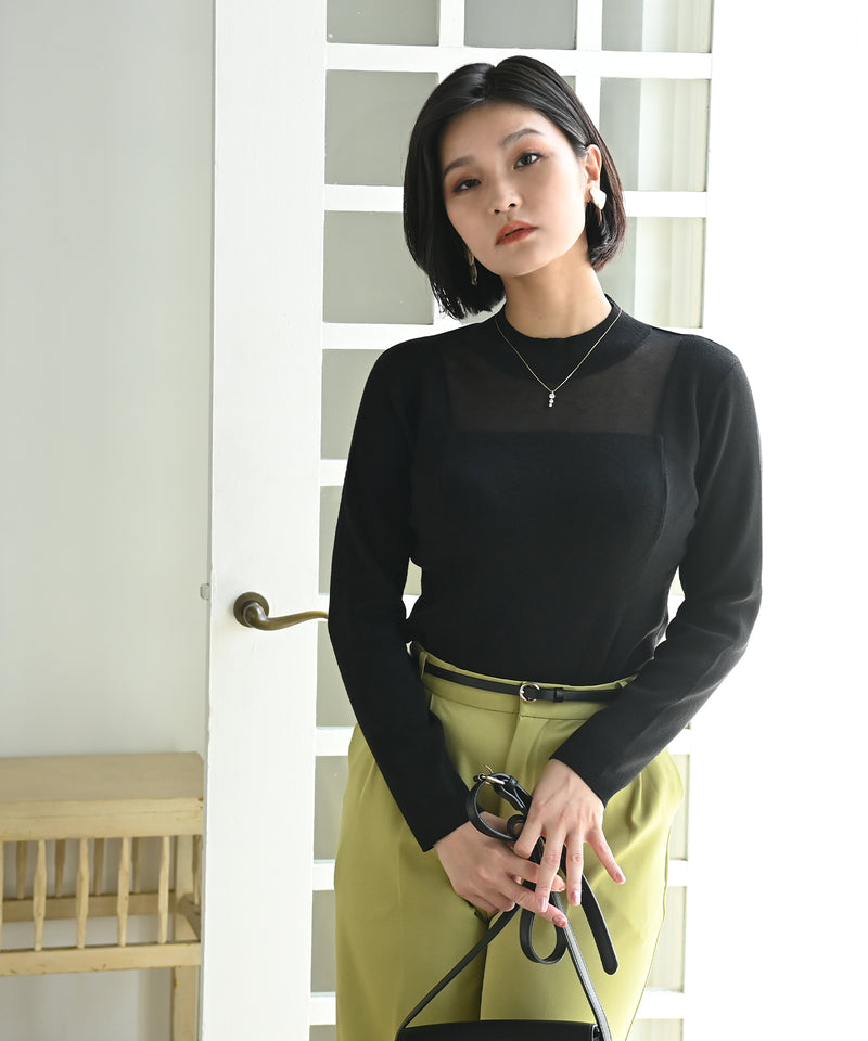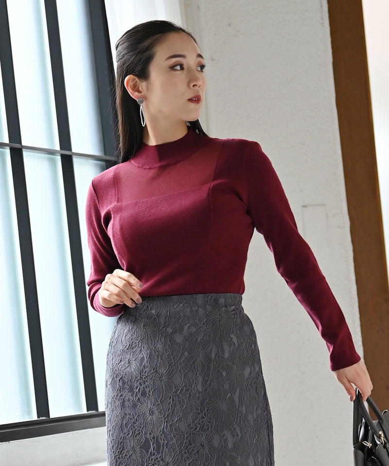 1枚着るだけで華やかな印象になる上品ニット。デコルテ部分をシアーな糸で編み込み、程よい透け感で大人の女性らしさを印象づける一枚。1枚で着用しても、シアー部分から下着のストラップが覗かないように設計にしました。ハイネックなので首元まで暖かく、肌あたりも良いレーヨン混ニット。 華美すぎない洗練されたデザインがコーディネートの幅をぐっと広げます。※こちらの商品は長袖シアーニットワンピースと同素材です。デザインの特性上、稀に糸の濃淡が出ることがございます。ご了承ください。 ■機能1HEART CLOSETの立体的なシルエットでバストを丸く包み込みながらもアンダーバストからウエストはスッキリしたシルエットに。■機能21枚で着用しても、シアー部分から下着のストラップが覗きづらい絶妙な開きに設計。