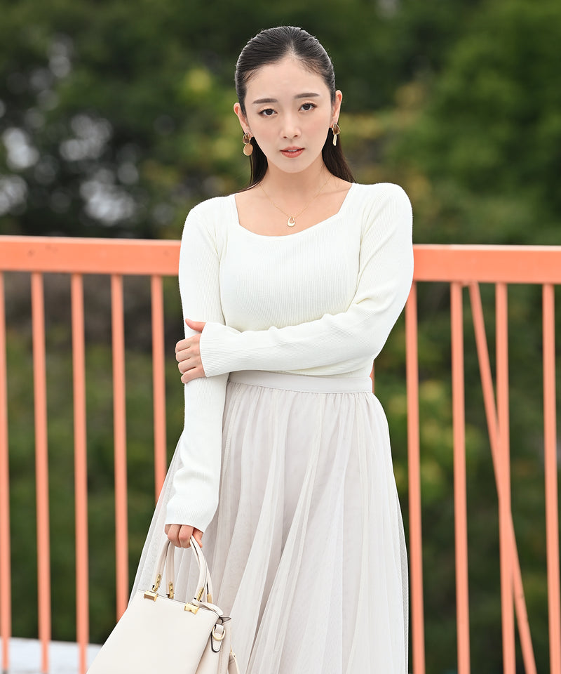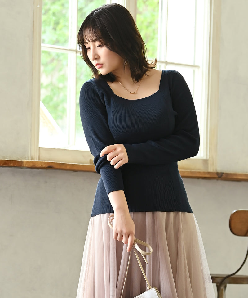 シンプルで着回しの効くスクエアネックリブニット。スッキリとしたスクエアネックはデコルテを綺麗に見せ、胸元も覗きづらいカッティングにデザインしました。インでもアウトでも着られる丈感にデザインし、レーヨンナイロンを原料としたストレッチヤーンで、着心地も快適に。 ■機能1HEART CLOSETの立体的な裁断でバストを丸く包み込みながらもアンダーバストからウエストはスッキリしたシルエットに。 ■機能2スッキリとしたスクエアネックはデコルテを綺麗に見せ、胸元も覗きづらいカッティングに設計。
