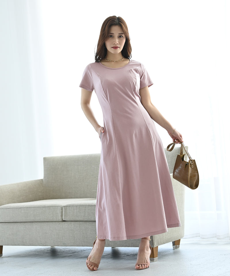 人気の半袖フレアワンピースが再登場。定番カラーに春らしい新色を追加しました。上質なコットン100%素材の生地を使用し、軽くて肌当たりのよい快適な着心地を追求しました。ボディラインを美しく見せてくれるシルエットで、お出かけや、リラックスシーンなど幅広いシーンでお召しいただけます。■機能1HEART CLOSETの立体的な裁断でバストを丸く包み込みながらもアンダーバストからウエストはスッキリしたシルエットに。■機能2かがんでもバストが覗き辛い、絶妙なラウンドネック。■機能3両脇にはポケットをつけ、ユーティリティもプラス。