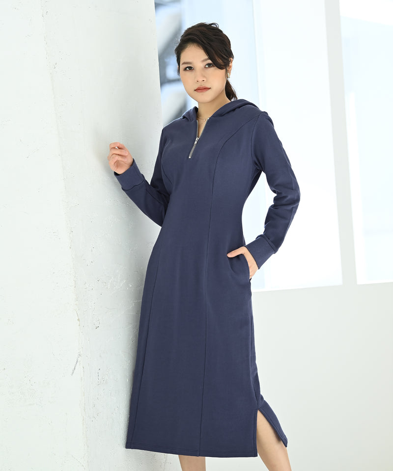 フロントジップがアクセントのパーカーワンピース。コットン100%の国産裏毛素材で、伸縮性もあり着心地も抜群です。タイトなシルエットで女性らしい印象に、ボディラインもスッキリ見せ。ファスナーの開け方次第で印象をガラリと変えられます。春らしい4色をセレクト。おでかけにも普段着にも、あらゆるシーンで活躍します。 ■機能1HEART CLOSETの立体的なシルエットでバストを丸く包み込みながらもアンダーバストからウエストはスッキリしたシルエットに。■機能2フロントジップのアレンジで、手軽に印象のチェンジが可能に。 ■機能3お手入れのしやすいコットン100%素材で、着心地も抜群。