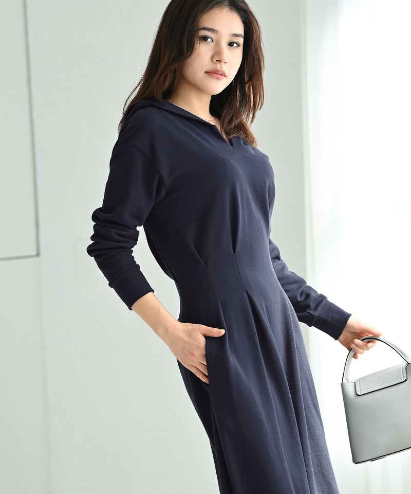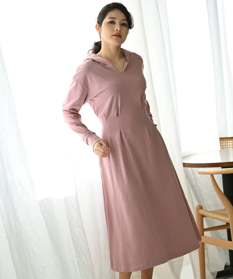 ウエストタックがアクセントのパーカーワンピース。コットン100%の国産裏毛素材で、伸縮性もあり着心地も抜群です。前後に入ったタックが、ボディラインをすっきりしたシルエットに見せてくれます。フレアに広がったスカートでパーカーワンピースながらも、エレガントな印象に。おでかけにもリラックスウェアとしても、シーンを選ばず着ていただけます。 ■機能1HEART CLOSETの立体的な裁断でバストを丸く包み込みながらもアンダーバストからウエストはスッキリしたシルエットに。 ■機能2ネックラインは詰まってみせない抜け感を演出しながらも、谷間が覗きづらい絶妙なVネック。■機能3両脇にはポケットをつけ、ユーティリティもプラス。
