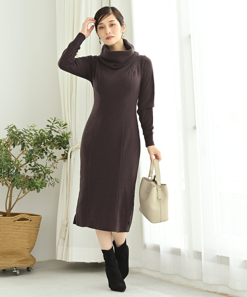 オフタートルのニットワンピース。くたっとしたオフタートルが首元をすっきりさせ、立体裁断でバストからウエストまでを美しく見えるシルエットに。両サイドにスリットをあけ、動きやすさも重視。1枚で着ても、デニムなどと合わせてレイヤードコーディネートにも。ウール混素材なので、冬でも暖かく快適にお過ごしいただけます。■機能1HEART CLOSETの立体的なシルエットでバストを丸く包み込みながらもアンダーバストからウエストはスッキリしたシルエットに。■機能2首が詰まって見えがちなハイネックも、くたっとしたオフタートルで、首元は暖かいながらも抜け感が出るデザイン。