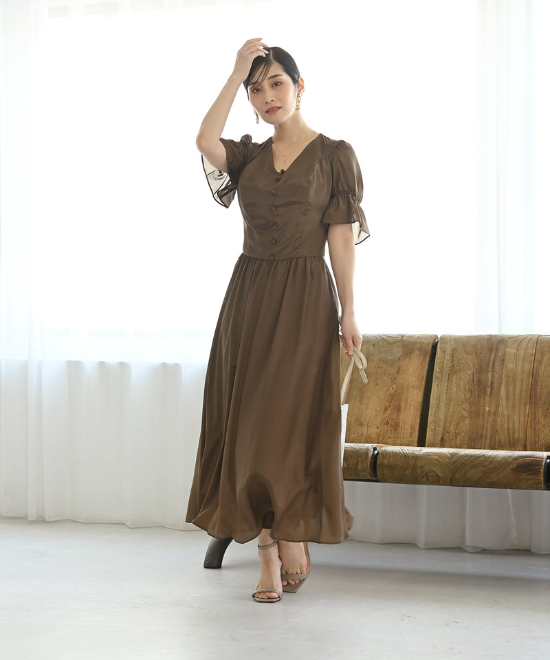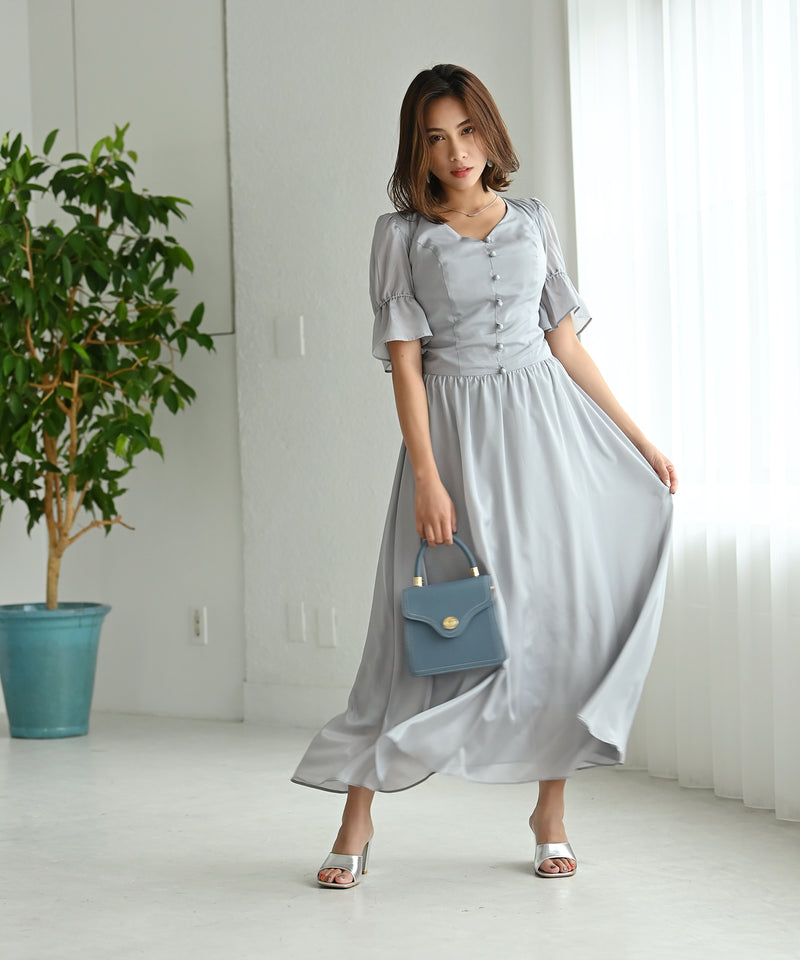 華やかなパールシフォンのマキシワンピース。トレンドのシアー感で今年らしい雰囲気に、より涼しげで軽やかな着こなしが楽しめます。身頃部分には、肌触りの良い上質なキュプラ裏地付き。袖口の広がったデザインのパフスリーブは、二の腕もすっきり見せます。1枚着るだけででコーディネートの完成する、上品ワンピースです。 ■機能1フロントのくるみボタンをフェイク仕様にし、ボタンの隙間が開かない設計に。 ■機能2HEART CLOSETの立体的な裁断でバストを丸く包み込みながらもアンダーバストからウエストはスッキリしたシルエットに。 ■機能3サイドにつけたリボンをウエストマークやバックリボンにして、自分らしい着こなしが可能。