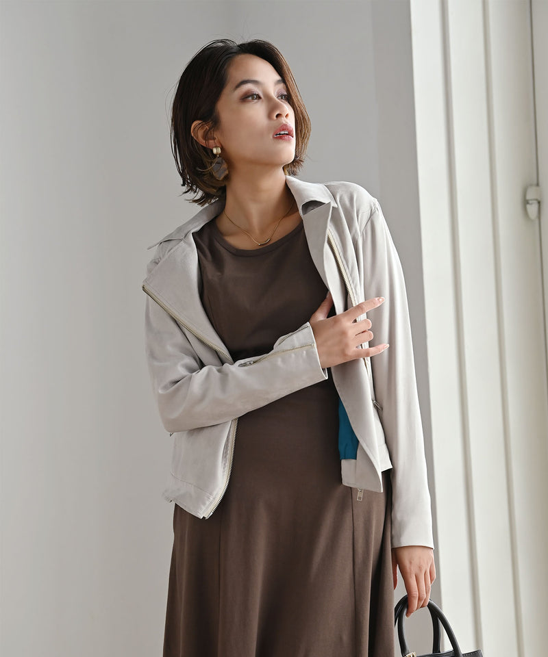 人気のライダースジャケットから、ニュアンスカラーのスエード生地の3色が新たに登場。柔らかくソフトな風合いで、より着やすくフェミニンな印象に。体に沿ったシルエットとコンパクトなサイズ感で、通勤からお出かけまであらゆるシーンで活躍します。高級ヌバック調の国産フェイク生地で、環境にもやさしいエコ素材です。ターコイズの裏地が、周りと差をつけるアクセントに。1枚着るだけで、日常を彩る上質ワードローブ。 ■機能1HEART CLOSETの立体的な裁断でバストを丸く包み込みながらもアンダーバストからウエストはスッキリしたシルエットに。 ■機能2両脇にはポケットをつけ、ユーティリティもプラス。■機能3高級なヌバック調の国産フェイク素材を使用。上品な質感と軽やかな着心地が特徴の、ファッショナブルなエコ素材です。