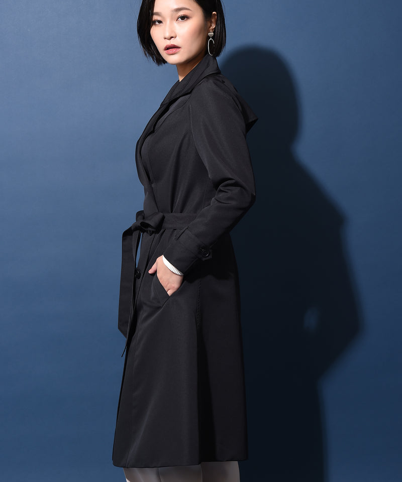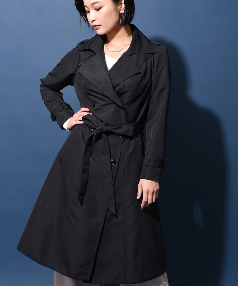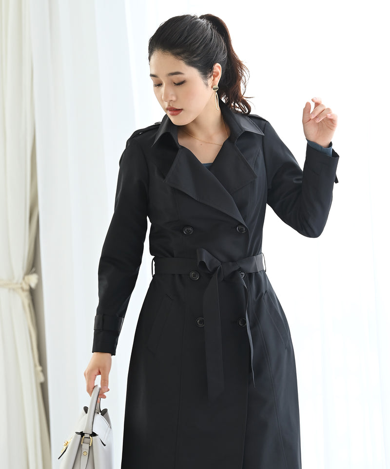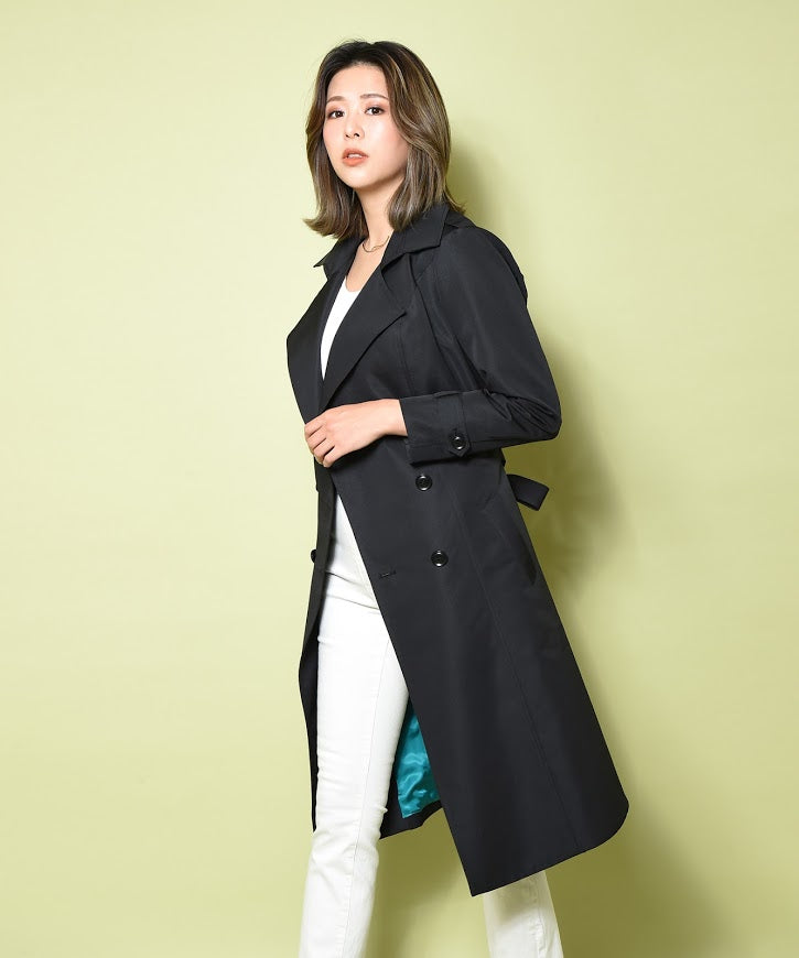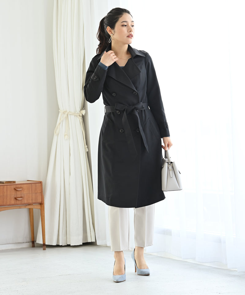 シンプルで高級感のある定番トレンチコート。オフィスでも普段使いでも、あらゆるシーンで活躍します。シワになりづらく、少し光沢のあるグログラン生地を使用。少しフレアになった裾が細見えを強調してくれます。裏地には遊び心のあるターコイズブルーを合わせ、シンプルリッチな印象に。