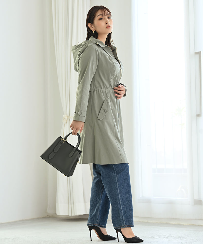 シンプルなデザインで使い勝手の良いカジュアルロングコート。肌触りの良いコットン素材に、裏地は高品質な国産キュプラ素材を使用。フードは取り外しも出来るので、シーンによって綺麗めな雰囲気に変えられるのもポイントです。ヒップが隠れタイトに見せるロング丈で、縦長のシルエットに。1枚着るだけで、こなれ感のある上品コーディネートが完成します。 ※ファスナーは全色共通でゴールドが付きます。 ※裏地は身頃生地と同系色が付きます。 ■機能1HEART CLOSETの立体的な裁断でバストを丸く包み込みながらもアンダーバストからウエストはスッキリしたシルエットに。 ■機能2取り外しのできるフードで、ミニマルな印象にも。■機能3両脇にはポケットをつけ、ユーティリティもプラス。 ■機能4上着の内側に付けたコードストッパーでウエストシルエットを自在に調整可能。