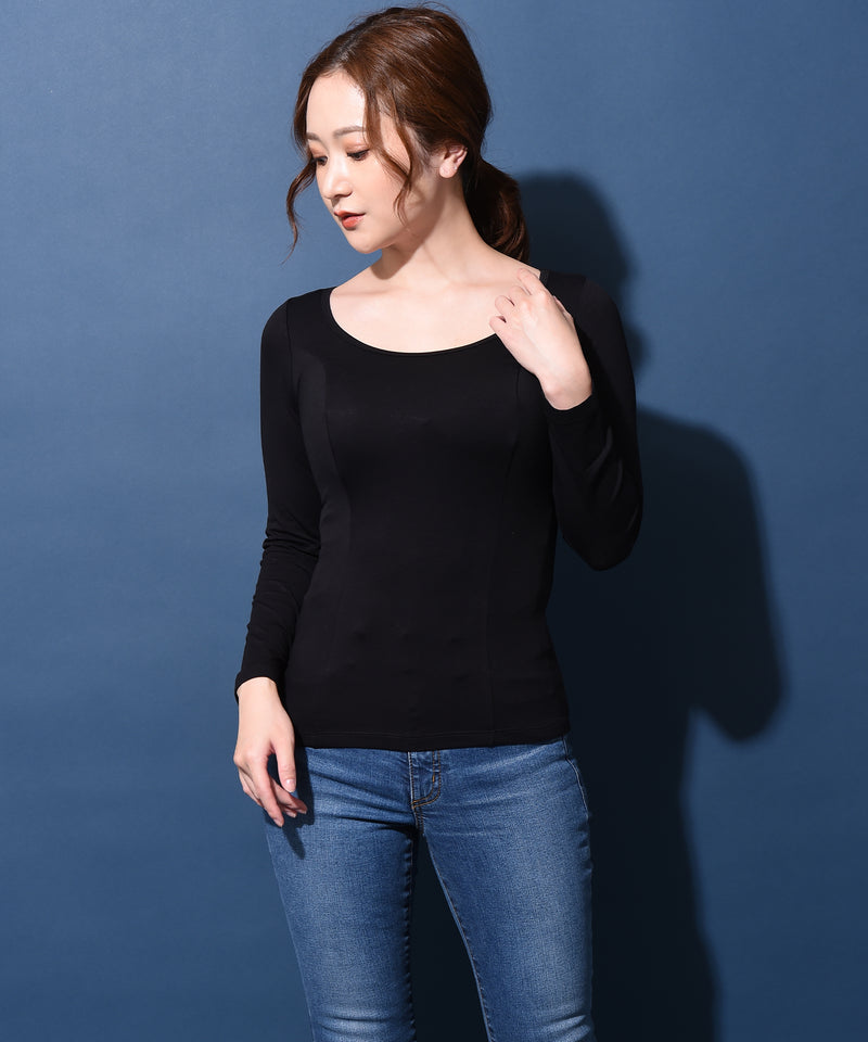 寒い季節のインナーとして着れる、ウォームインナー。長袖仕様と深く開いたラウンドネックで、あらゆるトップスのインナーとしてお使いいただけます。優れた保温性で暖かさを保ち、伸縮性に優れた全方向ストレッチで着心地も抜群。ご家庭でのお手入れも簡単な国産生地です。※こちらの商品は5分袖ウォームインナーと同素材です。